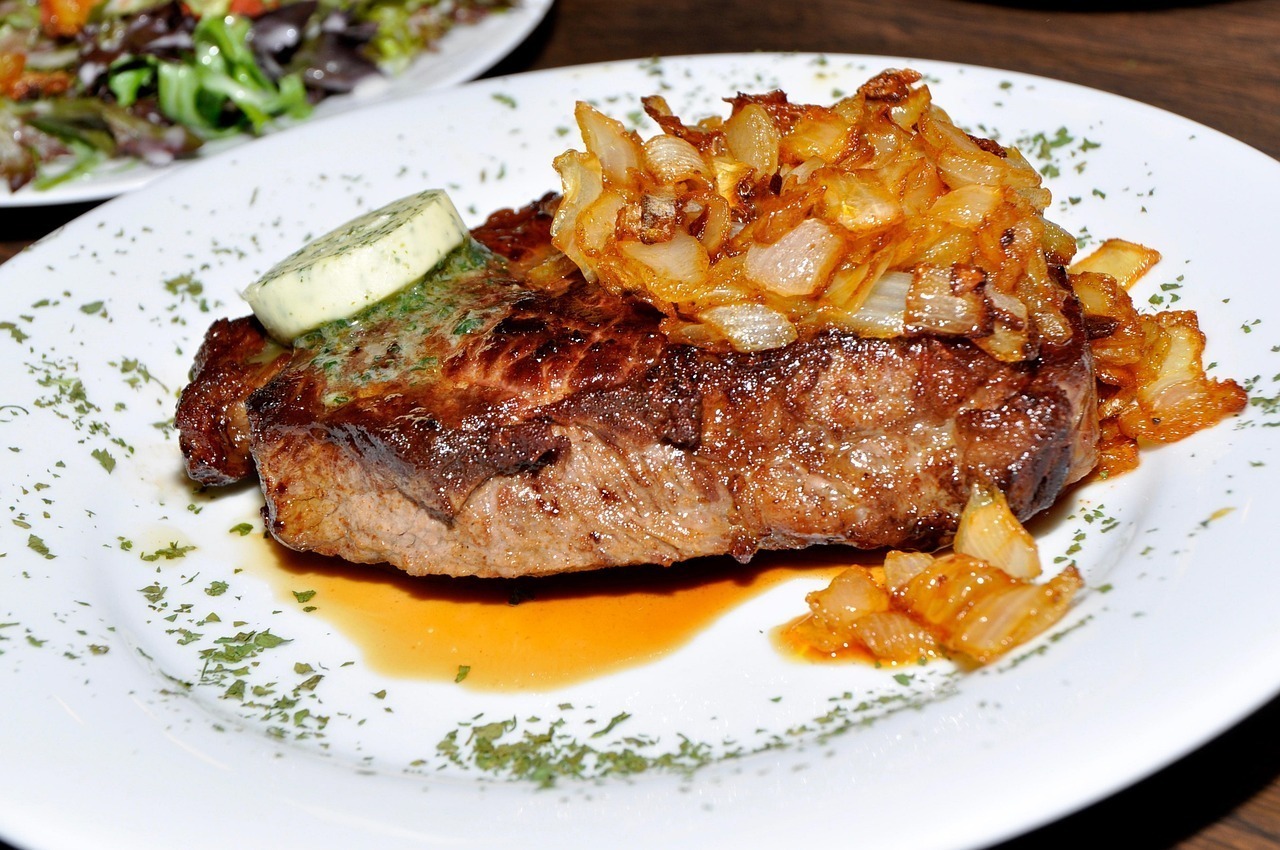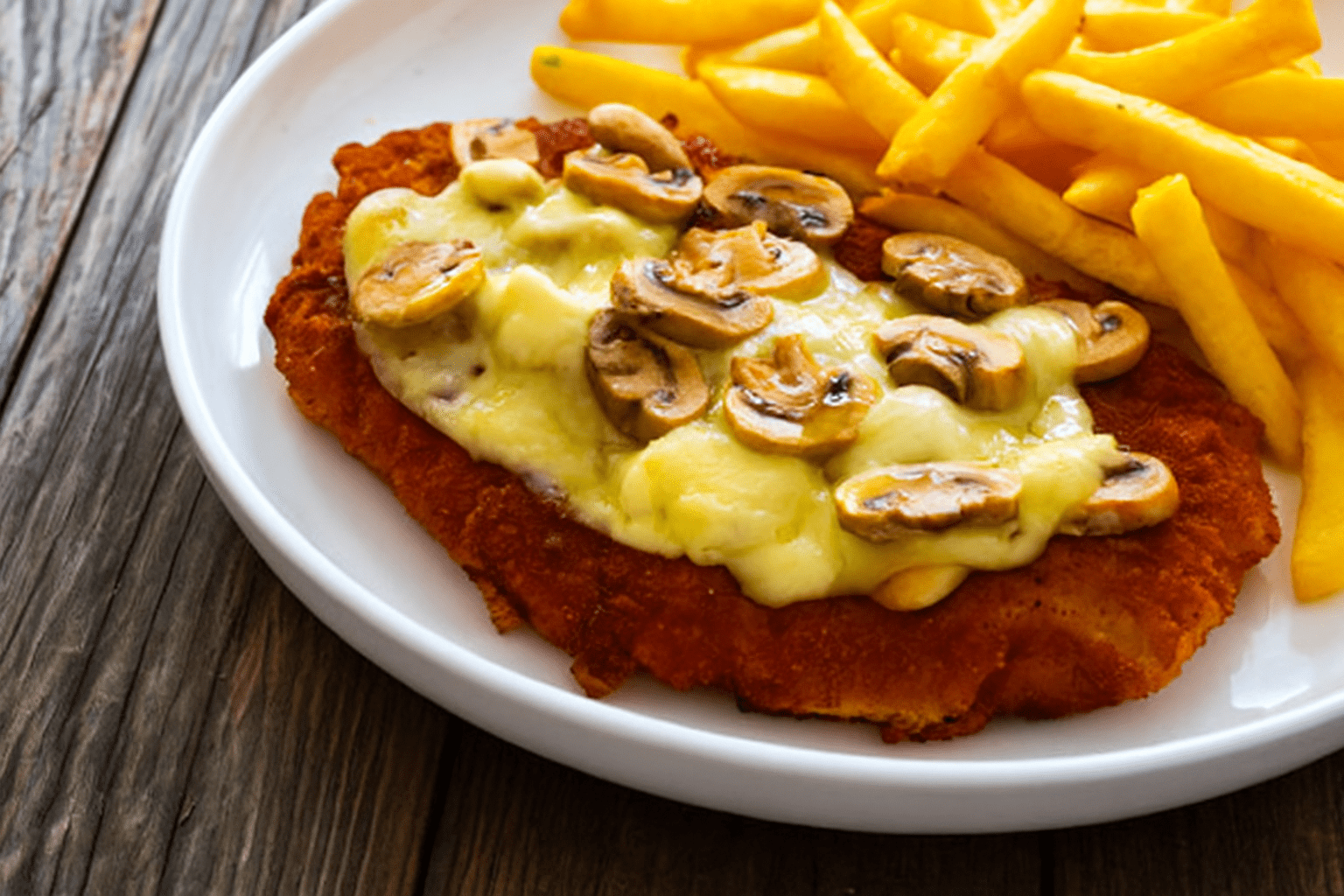 mit Champignonrahmsoße und Käse überbacken, Pommes und Beilagensalat