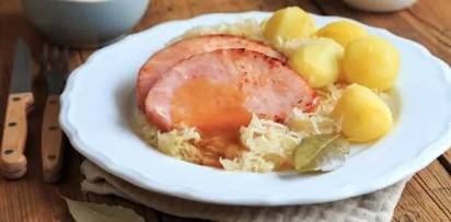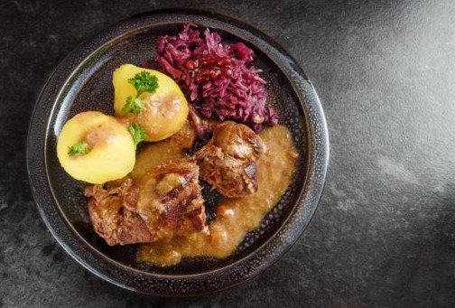 mit dunkler Soße, Kartoffelstampf und Rotkohl